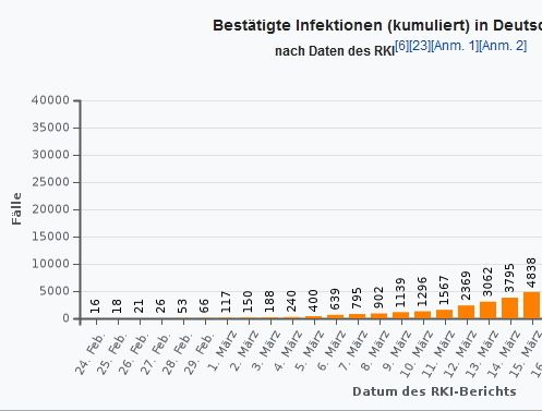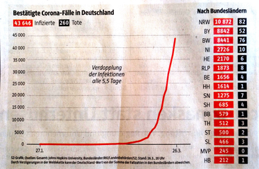1. Täglich bekommt man eine neue Katastrophenzahl an den Kopf geschmissen, damit man möglichst geschockt sein soll. Soll Panik erzeugt werden? Oder was sonst. Aus dieser Zahl lernt man NICHTS. Aber dann wird ja auch gleich beschwichtigt: Ja, wir haben zwar 5000 Infizierte (15.3.), aber Italien, da ist es viel schlimmer: 25000. Ja bei uns kann das ja nicht passieren. Fataler Irrtum (s.u.)