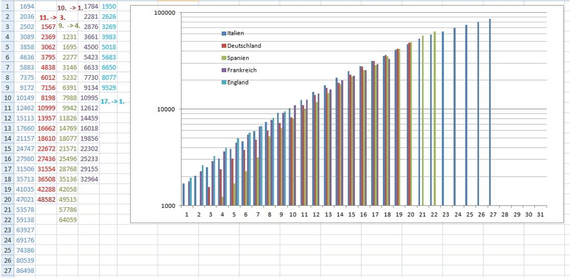 Also habe ich in der Graphik die Kurven von I, D, His, F und GB eingetragen, wobei D um 8 Tage, Spanien um 5 Tage, England um 16 und F um 9 Tage nach links verschoben sind. Nun gibt es in der 1. Wochen zwar interessante Unterschiede, aber die Kurven sind ab dem 10. doch sehr ähnlich, nur eben zeitverschoben.