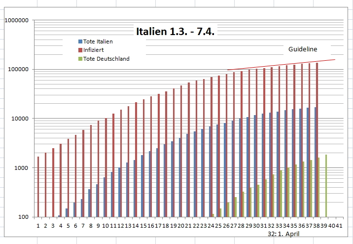 Nun zum Thema: wir sind ja viel besser dran als z.B. diese Italiener. Ständig werden die aktuellen Länderwerte verglichen. Und alle meinen, wenn die Werte kleiner sind als woanders, ist es nicht so schlimm bei uns. Ein kapitaler Denkfehler, der die Natur exponentiell wachsener Größen völlig verkennt. In Wahrheit spiegelt sich bei den unterschiedlichen Werten nur die Tatsache, dass die Kurve bei uns später angefangen hat. Beispiel: Am 15.3. hatte Deutschland 5000, Italien 25000 Infizierte. Grund zum feiern? Keineswegs. Die 25000 wurden in Deutschland eine gute Woche später erreicht!