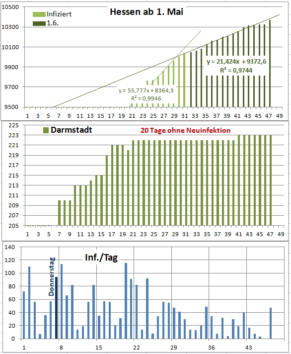 Gute Nachricht für Darmstadt: Gesamtinfektionen 20 Tage ab 21.5. konstant 222! Dann 7 Tage 223.