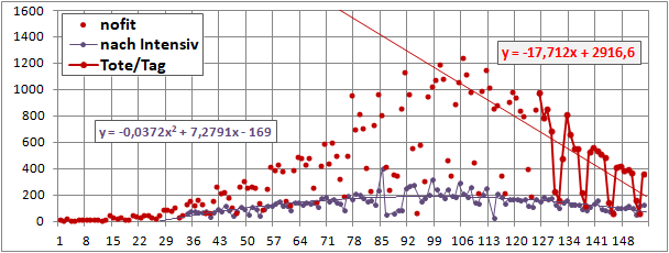 Sterbeinzidenz 260 (0), Linearer 4-Wochenfit fallend: -18/Tag!