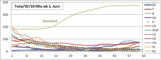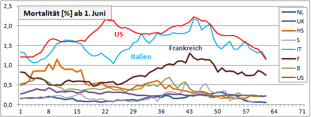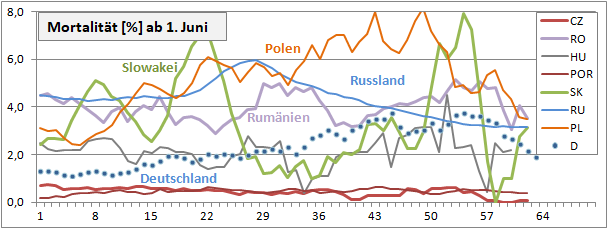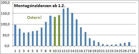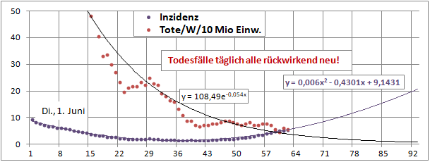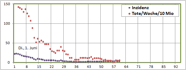 Inzidenz fiel 66 Tage von 177 auf 5, steigt seit 28 Tagen auf 18.4. Mortalität sinkt!