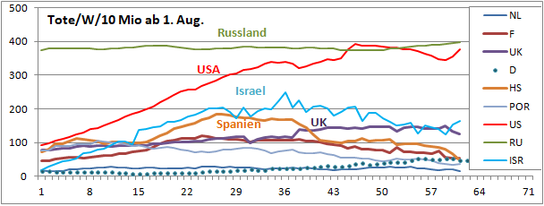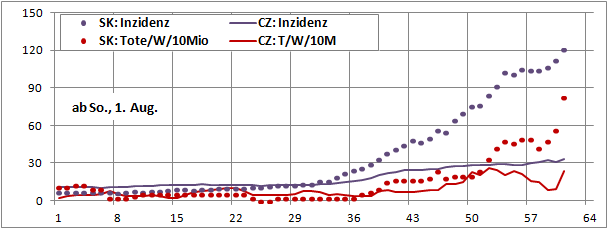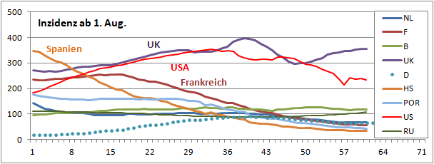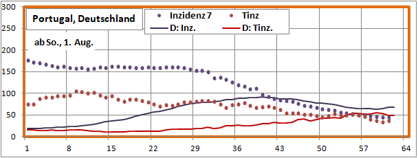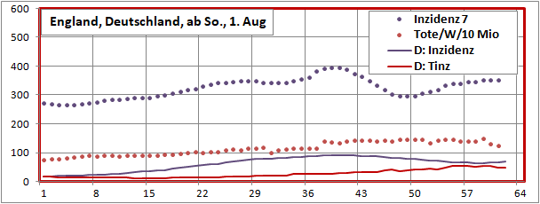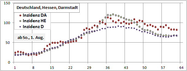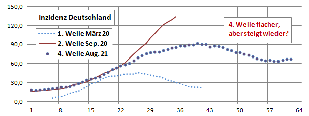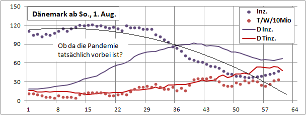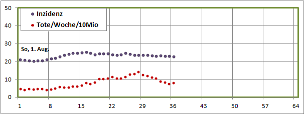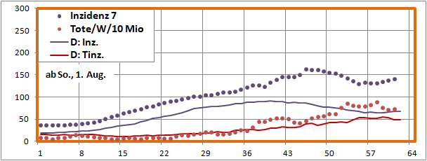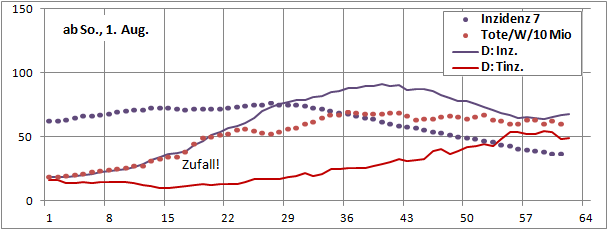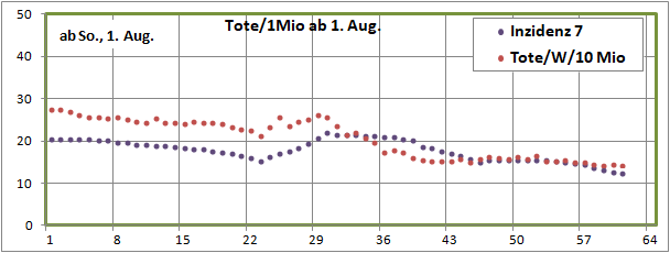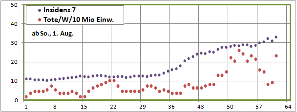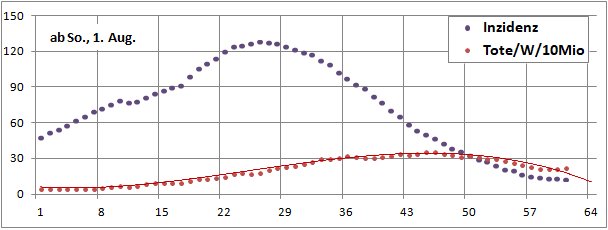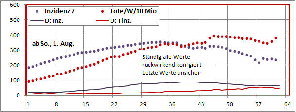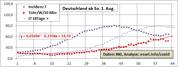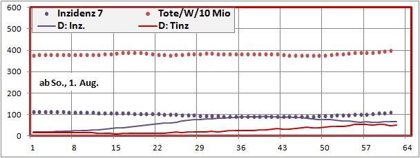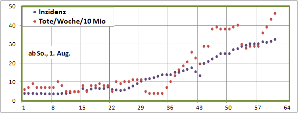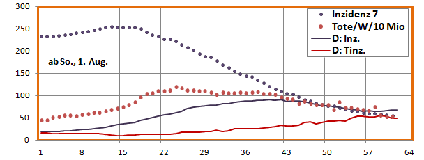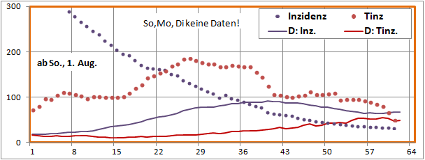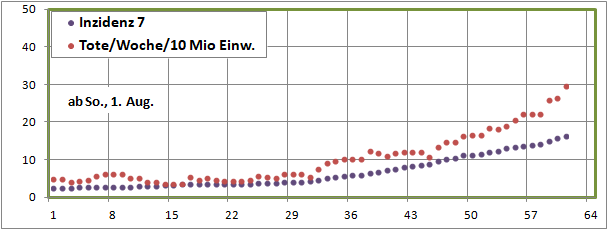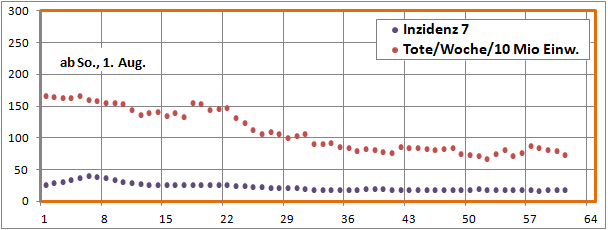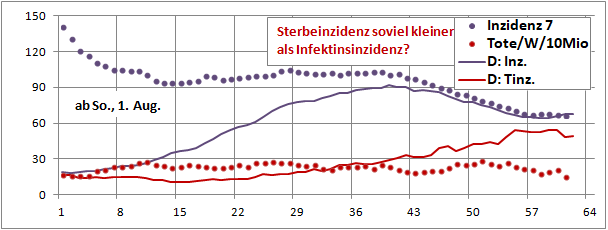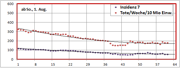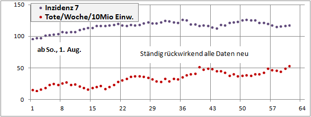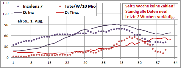Inzidenz fiel 66 Tage von 177 auf 5, stieg seit 63 Tagen stetig auf 91,6, jetzt 67,7. Mortalität stabil!