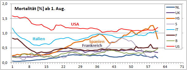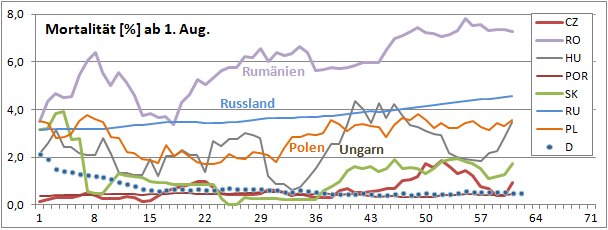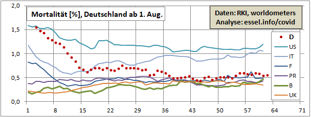 Die roten Werte geteilt durch die hellen ergeben die Mortalität in %.
