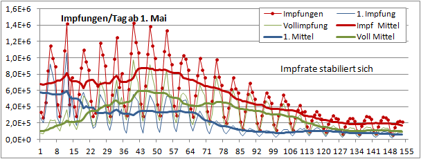 Mittlere Impfrate/Tag sinkt ab Mitte Juni von 860T -> 170T!