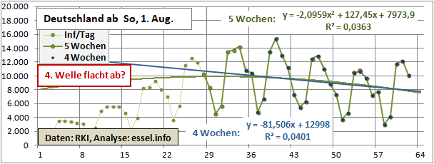 Linearer 4-Wochen-Fit fällt flacher: -80/Tag (gestern -130).