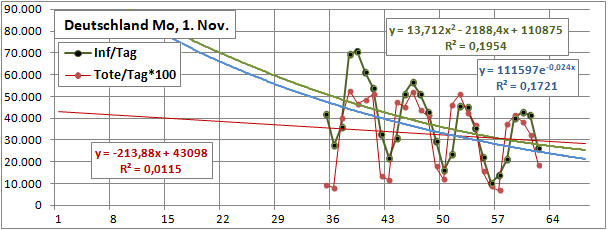 Linearer 4-Wochenfit fällt: -2,1/Tag (gestern -1,4), Quadratfit auch.
