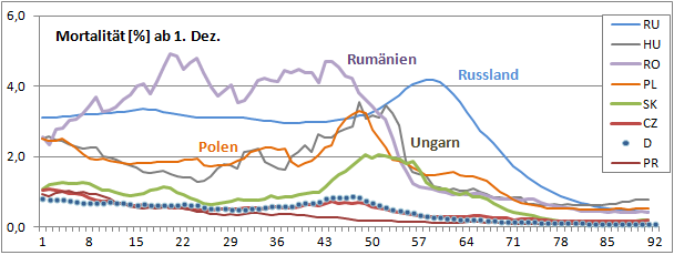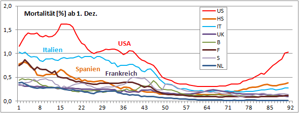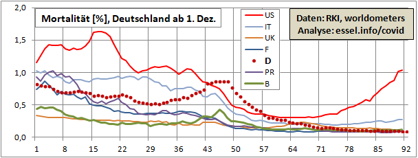 Die roten Werte geteilt durch die hellen ergeben die Mortalität in %.