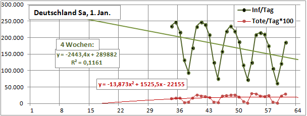 Linearer 4-Wochen-Fit -2.400/Tag (gestern -2.800), Quadratfit geht runter!
