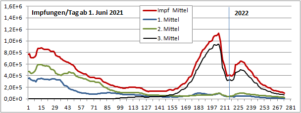 Mittlere Impfrate/Tag sank von 860 Tausend auf 130, jetzt 30 plus 70 3. Impfung!