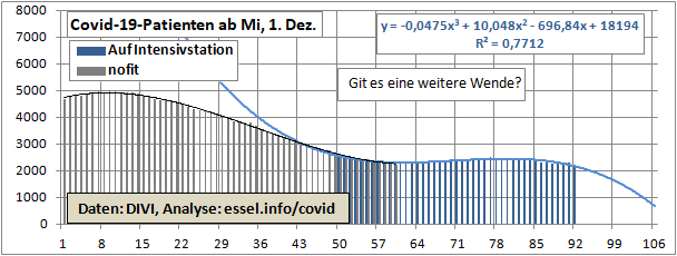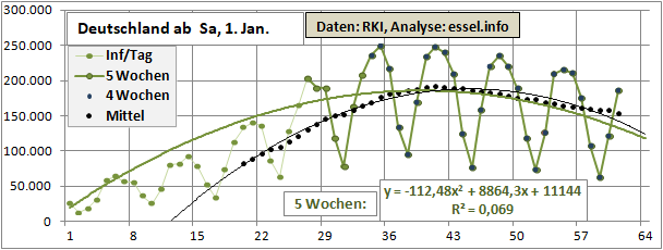 Linearer 4-Wochenfit steigt: +2,1/Tag (gestern +0,8), Quadratfit flach!