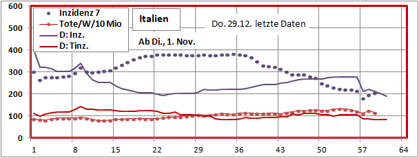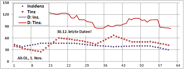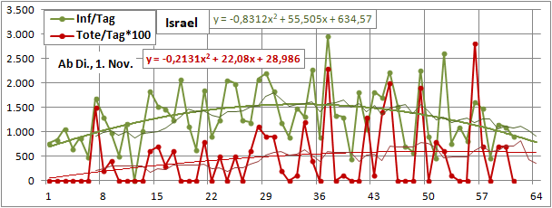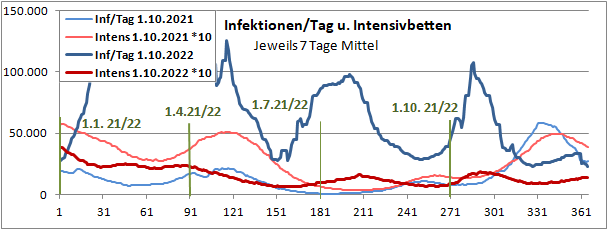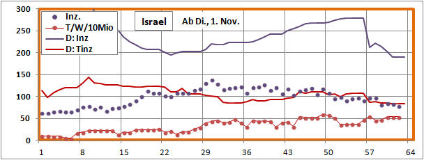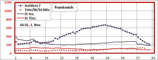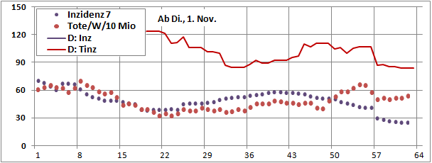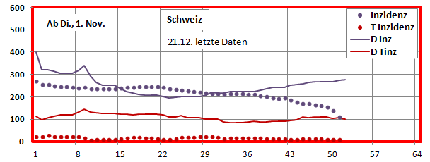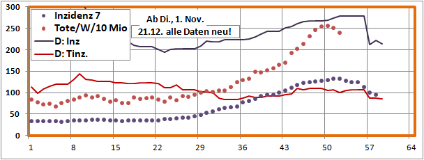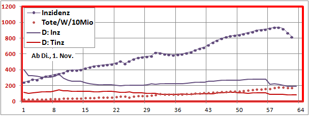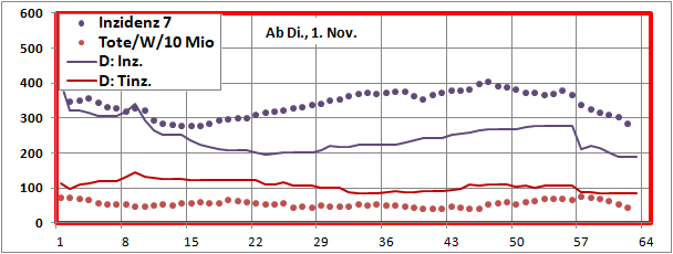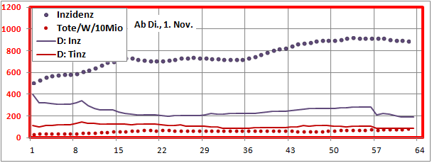 letztes Max=900, Min=200, jetzt 190 (-10), Sterbeinzidenz 84 (-2), Mortalität 0,4%.