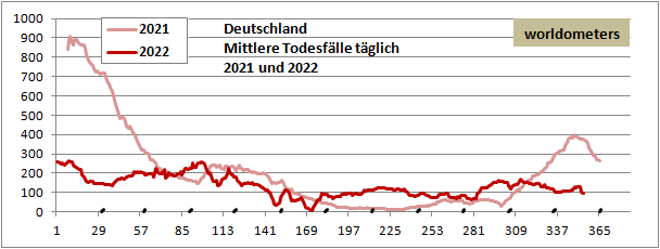 Welt: 650 Mio infiziert (0,4 Mio/Tag, stetig), 6,6 Mio tot (1 T/Tag, nimmt ab).