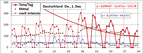 Die roten Werte geteilt durch die hellen ergeben die Mortalität in %.