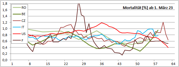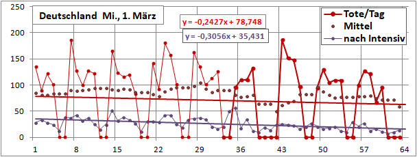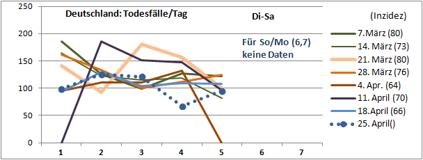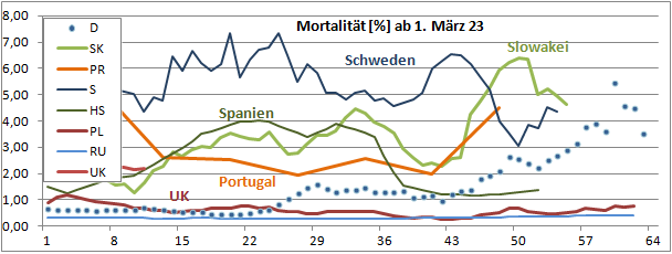 Die roten Werte geteilt durch die hellen ergeben die Mortalität in %.