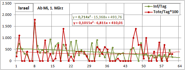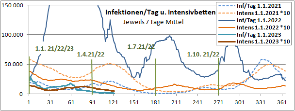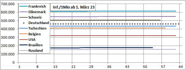 Welt: 680 Mio infiziert (130 T/Tag, fallend), 7 Mio tot (800/Tag, fallend).