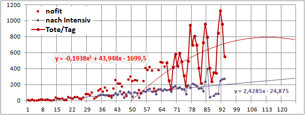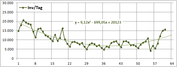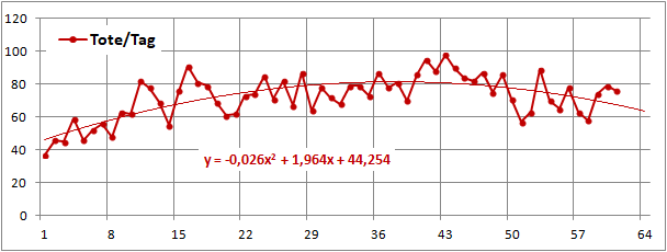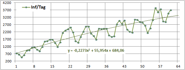 Wenn die Tageswerte linear zunehmen, wachsen die Gesamtzahlen mit [s*x+q*x
