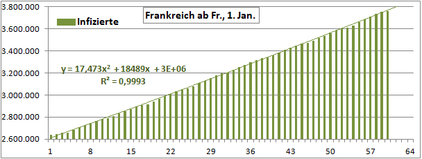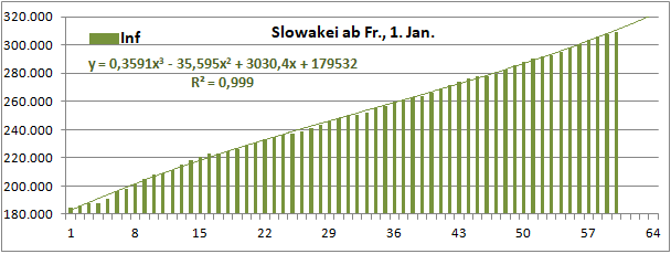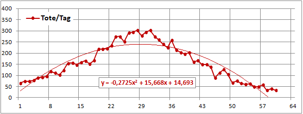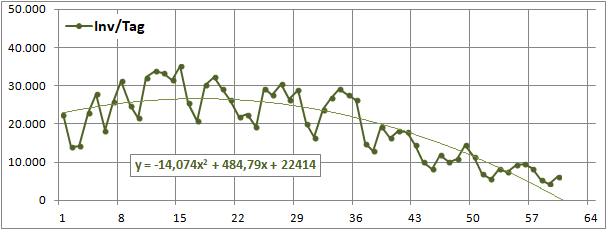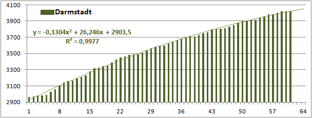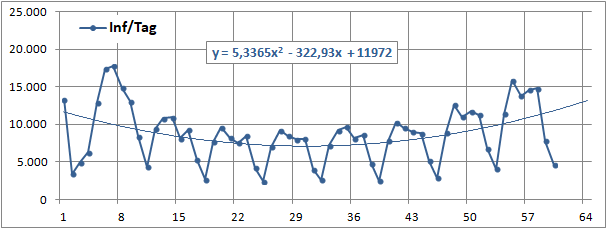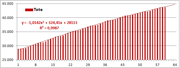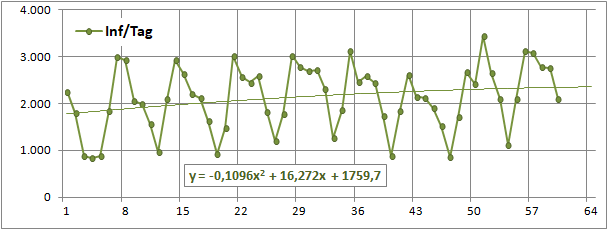 Wenn die Tageswerte quadratisch zunehmen, wachsen die Gesamtzahlen mit [s*x+q*x