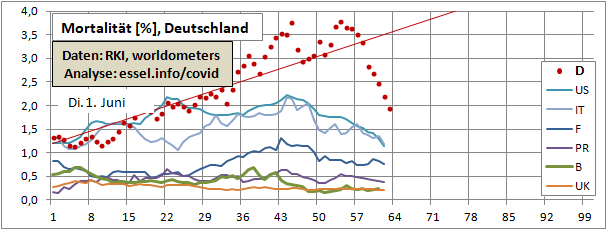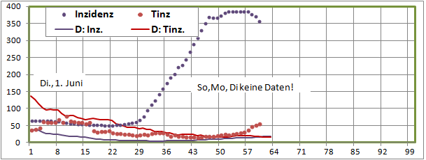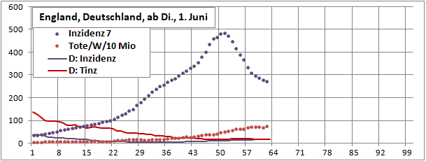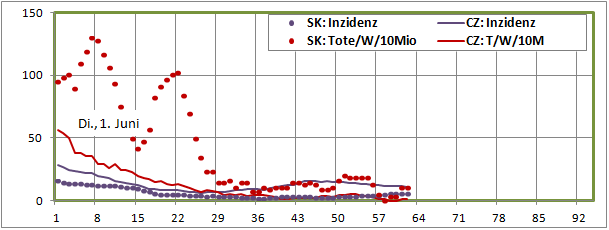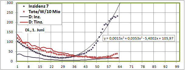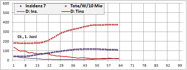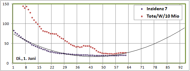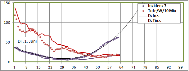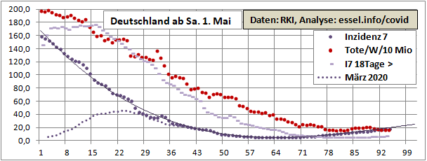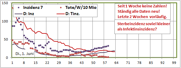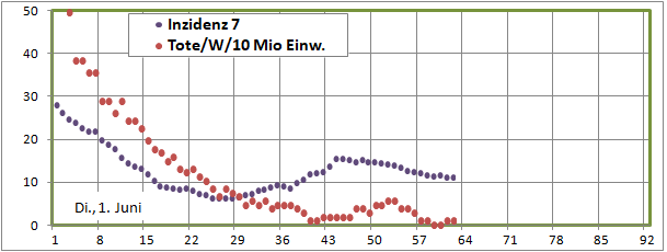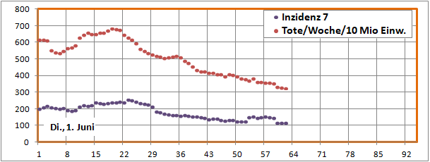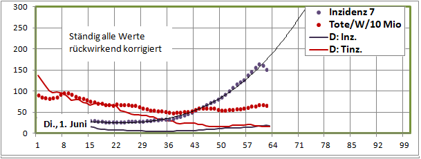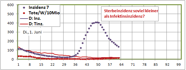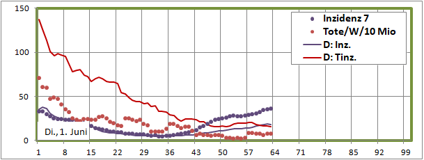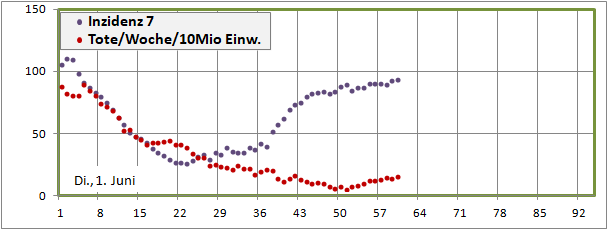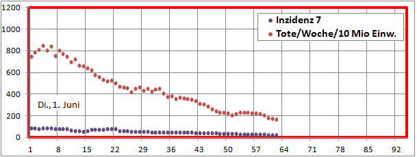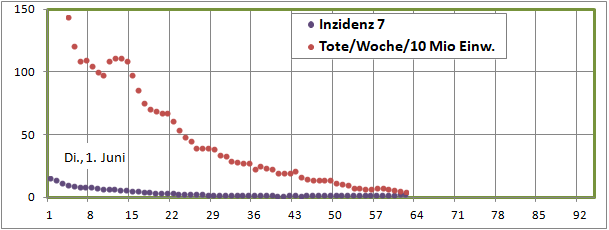 Sterbeinzidenz (pro Woche, pro 10 Mio Einwohner) wäre auf frühere (vor 18 Tagen) Inzidenz zu beziehen.