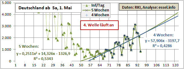 Zitat RKI: "Dieser 4-Tage-Wert bildet das Infektionsgeschehen vor etwa einer bis zwei Wochen ab."