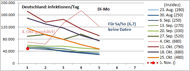 Zitat RKI: "Dieser 4-Tage-Wert bildet das Infektionsgeschehen vor etwa einer bis zwei Wochen ab."