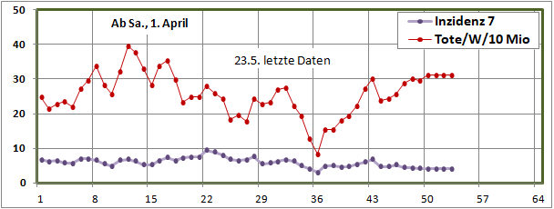 Sterbeinzidenz (pro Woche, pro 10 Mio Einwohner) wäre auf frühere (vor 18 Tagen) Inzidenz zu beziehen.